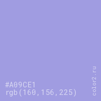 Цвет #A09CE1 в цветовой модели RGB обозначается тремя октетами (160, 156, 225) в десятичном формате и #A09CE1 в шестнадцатиричном (hex) формате, которые являются интенсивностью красного 160 (hex A0), интенсивность зелёного 156 (hex 9C) и интенсивность синего 225 (hex E1).