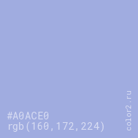 Цвет #A0ACE0 в цветовой модели RGB обозначается тремя октетами (160, 172, 224) в десятичном формате и #A0ACE0 в шестнадцатиричном (hex) формате, которые являются интенсивностью красного 160 (hex A0), интенсивность зелёного 172 (hex AC) и интенсивность синего 224 (hex E0).