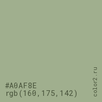 Цвет #A0AF8E в цветовой модели RGB обозначается тремя октетами (160, 175, 142) в десятичном формате и #A0AF8E в шестнадцатиричном (hex) формате, которые являются интенсивностью красного 160 (hex A0), интенсивность зелёного 175 (hex AF) и интенсивность синего 142 (hex 8E).