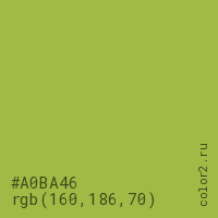 Цвет #A0BA46 в цветовой модели RGB обозначается тремя октетами (160, 186, 70) в десятичном формате и #A0BA46 в шестнадцатиричном (hex) формате, которые являются интенсивностью красного 160 (hex A0), интенсивность зелёного 186 (hex BA) и интенсивность синего 70 (hex 46).