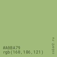Цвет #A0BA79 в цветовой модели RGB обозначается тремя октетами (160, 186, 121) в десятичном формате и #A0BA79 в шестнадцатиричном (hex) формате, которые являются интенсивностью красного 160 (hex A0), интенсивность зелёного 186 (hex BA) и интенсивность синего 121 (hex 79).