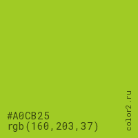Цвет #A0CB25 в цветовой модели RGB обозначается тремя октетами (160, 203, 37) в десятичном формате и #A0CB25 в шестнадцатиричном (hex) формате, которые являются интенсивностью красного 160 (hex A0), интенсивность зелёного 203 (hex CB) и интенсивность синего 37 (hex 25).