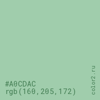 Цвет #A0CDAC в цветовой модели RGB обозначается тремя октетами (160, 205, 172) в десятичном формате и #A0CDAC в шестнадцатиричном (hex) формате, которые являются интенсивностью красного 160 (hex A0), интенсивность зелёного 205 (hex CD) и интенсивность синего 172 (hex AC).