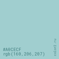 Цвет #A0CECF в цветовой модели RGB обозначается тремя октетами (160, 206, 207) в десятичном формате и #A0CECF в шестнадцатиричном (hex) формате, которые являются интенсивностью красного 160 (hex A0), интенсивность зелёного 206 (hex CE) и интенсивность синего 207 (hex CF).