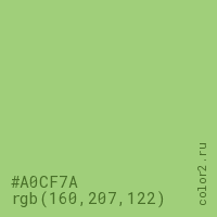 Цвет #A0CF7A в цветовой модели RGB обозначается тремя октетами (160, 207, 122) в десятичном формате и #A0CF7A в шестнадцатиричном (hex) формате, которые являются интенсивностью красного 160 (hex A0), интенсивность зелёного 207 (hex CF) и интенсивность синего 122 (hex 7A).