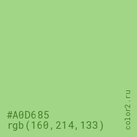 Цвет #A0D685 в цветовой модели RGB обозначается тремя октетами (160, 214, 133) в десятичном формате и #A0D685 в шестнадцатиричном (hex) формате, которые являются интенсивностью красного 160 (hex A0), интенсивность зелёного 214 (hex D6) и интенсивность синего 133 (hex 85).