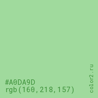 Цвет #A0DA9D в цветовой модели RGB обозначается тремя октетами (160, 218, 157) в десятичном формате и #A0DA9D в шестнадцатиричном (hex) формате, которые являются интенсивностью красного 160 (hex A0), интенсивность зелёного 218 (hex DA) и интенсивность синего 157 (hex 9D).
