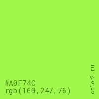 Цвет #A0F74C в цветовой модели RGB обозначается тремя октетами (160, 247, 76) в десятичном формате и #A0F74C в шестнадцатиричном (hex) формате, которые являются интенсивностью красного 160 (hex A0), интенсивность зелёного 247 (hex F7) и интенсивность синего 76 (hex 4C).