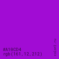 Цвет #A10CD4 в цветовой модели RGB обозначается тремя октетами (161, 12, 212) в десятичном формате и #A10CD4 в шестнадцатиричном (hex) формате, которые являются интенсивностью красного 161 (hex A1), интенсивность зелёного 12 (hex 0C) и интенсивность синего 212 (hex D4).