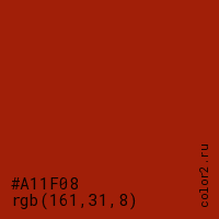 Цвет #A11F08 в цветовой модели RGB обозначается тремя октетами (161, 31, 8) в десятичном формате и #A11F08 в шестнадцатиричном (hex) формате, которые являются интенсивностью красного 161 (hex A1), интенсивность зелёного 31 (hex 1F) и интенсивность синего 8 (hex 08).
