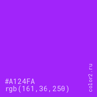 Цвет #A124FA в цветовой модели RGB обозначается тремя октетами (161, 36, 250) в десятичном формате и #A124FA в шестнадцатиричном (hex) формате, которые являются интенсивностью красного 161 (hex A1), интенсивность зелёного 36 (hex 24) и интенсивность синего 250 (hex FA).