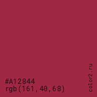 Цвет #A12844 в цветовой модели RGB обозначается тремя октетами (161, 40, 68) в десятичном формате и #A12844 в шестнадцатиричном (hex) формате, которые являются интенсивностью красного 161 (hex A1), интенсивность зелёного 40 (hex 28) и интенсивность синего 68 (hex 44).