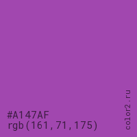 Цвет #A147AF в цветовой модели RGB обозначается тремя октетами (161, 71, 175) в десятичном формате и #A147AF в шестнадцатиричном (hex) формате, которые являются интенсивностью красного 161 (hex A1), интенсивность зелёного 71 (hex 47) и интенсивность синего 175 (hex AF).