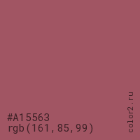 Цвет #A15563 в цветовой модели RGB обозначается тремя октетами (161, 85, 99) в десятичном формате и #A15563 в шестнадцатиричном (hex) формате, которые являются интенсивностью красного 161 (hex A1), интенсивность зелёного 85 (hex 55) и интенсивность синего 99 (hex 63).