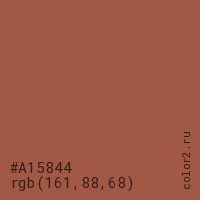 Цвет #A15844 в цветовой модели RGB обозначается тремя октетами (161, 88, 68) в десятичном формате и #A15844 в шестнадцатиричном (hex) формате, которые являются интенсивностью красного 161 (hex A1), интенсивность зелёного 88 (hex 58) и интенсивность синего 68 (hex 44).