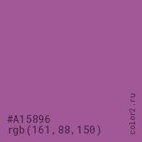 Цвет #A15896 в цветовой модели RGB обозначается тремя октетами (161, 88, 150) в десятичном формате и #A15896 в шестнадцатиричном (hex) формате, которые являются интенсивностью красного 161 (hex A1), интенсивность зелёного 88 (hex 58) и интенсивность синего 150 (hex 96).