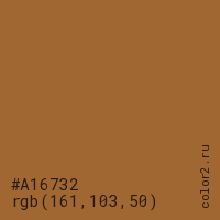 Цвет #A16732 в цветовой модели RGB обозначается тремя октетами (161, 103, 50) в десятичном формате и #A16732 в шестнадцатиричном (hex) формате, которые являются интенсивностью красного 161 (hex A1), интенсивность зелёного 103 (hex 67) и интенсивность синего 50 (hex 32).