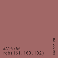 Цвет #A16766 в цветовой модели RGB обозначается тремя октетами (161, 103, 102) в десятичном формате и #A16766 в шестнадцатиричном (hex) формате, которые являются интенсивностью красного 161 (hex A1), интенсивность зелёного 103 (hex 67) и интенсивность синего 102 (hex 66).