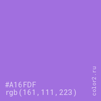 Цвет #A16FDF в цветовой модели RGB обозначается тремя октетами (161, 111, 223) в десятичном формате и #A16FDF в шестнадцатиричном (hex) формате, которые являются интенсивностью красного 161 (hex A1), интенсивность зелёного 111 (hex 6F) и интенсивность синего 223 (hex DF).