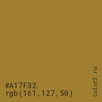 Цвет #A17F32 в цветовой модели RGB обозначается тремя октетами (161, 127, 50) в десятичном формате и #A17F32 в шестнадцатиричном (hex) формате, которые являются интенсивностью красного 161 (hex A1), интенсивность зелёного 127 (hex 7F) и интенсивность синего 50 (hex 32).