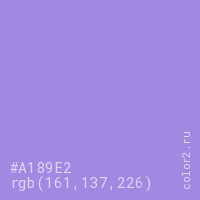 Цвет #A189E2 в цветовой модели RGB обозначается тремя октетами (161, 137, 226) в десятичном формате и #A189E2 в шестнадцатиричном (hex) формате, которые являются интенсивностью красного 161 (hex A1), интенсивность зелёного 137 (hex 89) и интенсивность синего 226 (hex E2).