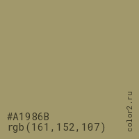 Цвет #A1986B в цветовой модели RGB обозначается тремя октетами (161, 152, 107) в десятичном формате и #A1986B в шестнадцатиричном (hex) формате, которые являются интенсивностью красного 161 (hex A1), интенсивность зелёного 152 (hex 98) и интенсивность синего 107 (hex 6B).