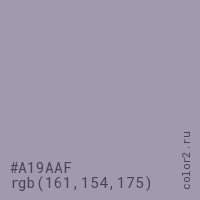 Цвет #A19AAF в цветовой модели RGB обозначается тремя октетами (161, 154, 175) в десятичном формате и #A19AAF в шестнадцатиричном (hex) формате, которые являются интенсивностью красного 161 (hex A1), интенсивность зелёного 154 (hex 9A) и интенсивность синего 175 (hex AF).