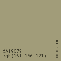 Цвет #A19C79 в цветовой модели RGB обозначается тремя октетами (161, 156, 121) в десятичном формате и #A19C79 в шестнадцатиричном (hex) формате, которые являются интенсивностью красного 161 (hex A1), интенсивность зелёного 156 (hex 9C) и интенсивность синего 121 (hex 79).