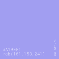 Цвет #A19EF1 в цветовой модели RGB обозначается тремя октетами (161, 158, 241) в десятичном формате и #A19EF1 в шестнадцатиричном (hex) формате, которые являются интенсивностью красного 161 (hex A1), интенсивность зелёного 158 (hex 9E) и интенсивность синего 241 (hex F1).