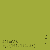 Цвет #A1AC3A в цветовой модели RGB обозначается тремя октетами (161, 172, 58) в десятичном формате и #A1AC3A в шестнадцатиричном (hex) формате, которые являются интенсивностью красного 161 (hex A1), интенсивность зелёного 172 (hex AC) и интенсивность синего 58 (hex 3A).
