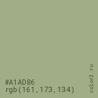 Цвет #A1AD86 в цветовой модели RGB обозначается тремя октетами (161, 173, 134) в десятичном формате и #A1AD86 в шестнадцатиричном (hex) формате, которые являются интенсивностью красного 161 (hex A1), интенсивность зелёного 173 (hex AD) и интенсивность синего 134 (hex 86).