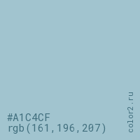 Цвет #A1C4CF в цветовой модели RGB обозначается тремя октетами (161, 196, 207) в десятичном формате и #A1C4CF в шестнадцатиричном (hex) формате, которые являются интенсивностью красного 161 (hex A1), интенсивность зелёного 196 (hex C4) и интенсивность синего 207 (hex CF).