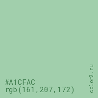 Цвет #A1CFAC в цветовой модели RGB обозначается тремя октетами (161, 207, 172) в десятичном формате и #A1CFAC в шестнадцатиричном (hex) формате, которые являются интенсивностью красного 161 (hex A1), интенсивность зелёного 207 (hex CF) и интенсивность синего 172 (hex AC).