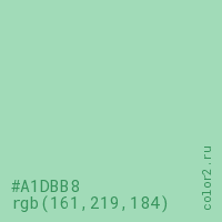 Цвет #A1DBB8 в цветовой модели RGB обозначается тремя октетами (161, 219, 184) в десятичном формате и #A1DBB8 в шестнадцатиричном (hex) формате, которые являются интенсивностью красного 161 (hex A1), интенсивность зелёного 219 (hex DB) и интенсивность синего 184 (hex B8).
