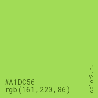 Цвет #A1DC56 в цветовой модели RGB обозначается тремя октетами (161, 220, 86) в десятичном формате и #A1DC56 в шестнадцатиричном (hex) формате, которые являются интенсивностью красного 161 (hex A1), интенсивность зелёного 220 (hex DC) и интенсивность синего 86 (hex 56).