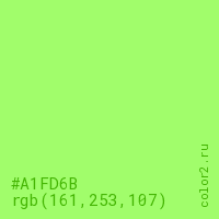 Цвет #A1FD6B в цветовой модели RGB обозначается тремя октетами (161, 253, 107) в десятичном формате и #A1FD6B в шестнадцатиричном (hex) формате, которые являются интенсивностью красного 161 (hex A1), интенсивность зелёного 253 (hex FD) и интенсивность синего 107 (hex 6B).