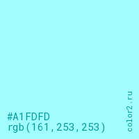 Цвет #A1FDFD в цветовой модели RGB обозначается тремя октетами (161, 253, 253) в десятичном формате и #A1FDFD в шестнадцатиричном (hex) формате, которые являются интенсивностью красного 161 (hex A1), интенсивность зелёного 253 (hex FD) и интенсивность синего 253 (hex FD).
