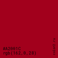 Цвет #A2001C в цветовой модели RGB обозначается тремя октетами (162, 0, 28) в десятичном формате и #A2001C в шестнадцатиричном (hex) формате, которые являются интенсивностью красного 162 (hex A2), интенсивность зелёного 0 (hex 00) и интенсивность синего 28 (hex 1C).