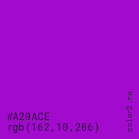 Цвет #A20ACE в цветовой модели RGB обозначается тремя октетами (162, 10, 206) в десятичном формате и #A20ACE в шестнадцатиричном (hex) формате, которые являются интенсивностью красного 162 (hex A2), интенсивность зелёного 10 (hex 0A) и интенсивность синего 206 (hex CE).