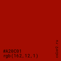 Цвет #A20C01 в цветовой модели RGB обозначается тремя октетами (162, 12, 1) в десятичном формате и #A20C01 в шестнадцатиричном (hex) формате, которые являются интенсивностью красного 162 (hex A2), интенсивность зелёного 12 (hex 0C) и интенсивность синего 1 (hex 01).