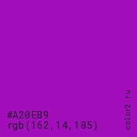 Цвет #A20EB9 в цветовой модели RGB обозначается тремя октетами (162, 14, 185) в десятичном формате и #A20EB9 в шестнадцатиричном (hex) формате, которые являются интенсивностью красного 162 (hex A2), интенсивность зелёного 14 (hex 0E) и интенсивность синего 185 (hex B9).
