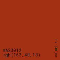 Цвет #A23012 в цветовой модели RGB обозначается тремя октетами (162, 48, 18) в десятичном формате и #A23012 в шестнадцатиричном (hex) формате, которые являются интенсивностью красного 162 (hex A2), интенсивность зелёного 48 (hex 30) и интенсивность синего 18 (hex 12).
