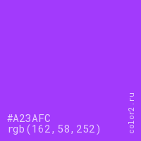 Цвет #A23AFC в цветовой модели RGB обозначается тремя октетами (162, 58, 252) в десятичном формате и #A23AFC в шестнадцатиричном (hex) формате, которые являются интенсивностью красного 162 (hex A2), интенсивность зелёного 58 (hex 3A) и интенсивность синего 252 (hex FC).