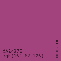 Цвет #A2437E в цветовой модели RGB обозначается тремя октетами (162, 67, 126) в десятичном формате и #A2437E в шестнадцатиричном (hex) формате, которые являются интенсивностью красного 162 (hex A2), интенсивность зелёного 67 (hex 43) и интенсивность синего 126 (hex 7E).