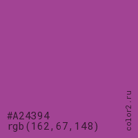 Цвет #A24394 в цветовой модели RGB обозначается тремя октетами (162, 67, 148) в десятичном формате и #A24394 в шестнадцатиричном (hex) формате, которые являются интенсивностью красного 162 (hex A2), интенсивность зелёного 67 (hex 43) и интенсивность синего 148 (hex 94).