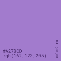 Цвет #A27BCD в цветовой модели RGB обозначается тремя октетами (162, 123, 205) в десятичном формате и #A27BCD в шестнадцатиричном (hex) формате, которые являются интенсивностью красного 162 (hex A2), интенсивность зелёного 123 (hex 7B) и интенсивность синего 205 (hex CD).