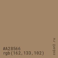 Цвет #A28566 в цветовой модели RGB обозначается тремя октетами (162, 133, 102) в десятичном формате и #A28566 в шестнадцатиричном (hex) формате, которые являются интенсивностью красного 162 (hex A2), интенсивность зелёного 133 (hex 85) и интенсивность синего 102 (hex 66).