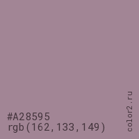 Цвет #A28595 в цветовой модели RGB обозначается тремя октетами (162, 133, 149) в десятичном формате и #A28595 в шестнадцатиричном (hex) формате, которые являются интенсивностью красного 162 (hex A2), интенсивность зелёного 133 (hex 85) и интенсивность синего 149 (hex 95).