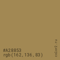 Цвет #A28853 в цветовой модели RGB обозначается тремя октетами (162, 136, 83) в десятичном формате и #A28853 в шестнадцатиричном (hex) формате, которые являются интенсивностью красного 162 (hex A2), интенсивность зелёного 136 (hex 88) и интенсивность синего 83 (hex 53).