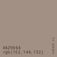 Цвет #A29084 в цветовой модели RGB обозначается тремя октетами (162, 144, 132) в десятичном формате и #A29084 в шестнадцатиричном (hex) формате, которые являются интенсивностью красного 162 (hex A2), интенсивность зелёного 144 (hex 90) и интенсивность синего 132 (hex 84).